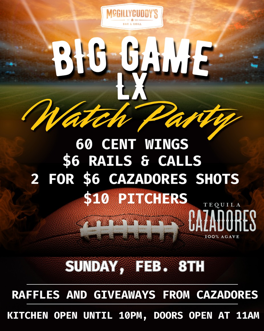 We're open all day for Super Bowl LX!! Drink and Food deals all day... kitchen is open until 10pm!